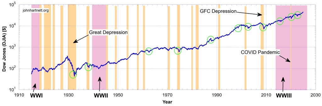 On Chart 1 I plot the Dow Jones from 1914 to December 24, 2024 on log-linear axes. The green circles indicate times of rapid decline in the index.