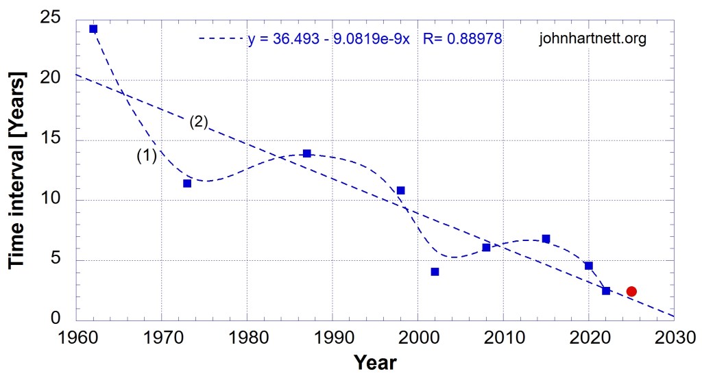 From those dates I assembled a list and calculated the time interval in years between when they occurred. In Chart 3 I have plotted these intervals except for the first one from August 1931 to February 1938. The period of the Great Depression up to World War II (1940) is a bit chaotic. So my Chart 3 starts in 1962 with first interval from 1938 of 24 years. Whether or not this should have started in 1940 makes very little difference to the analysis.