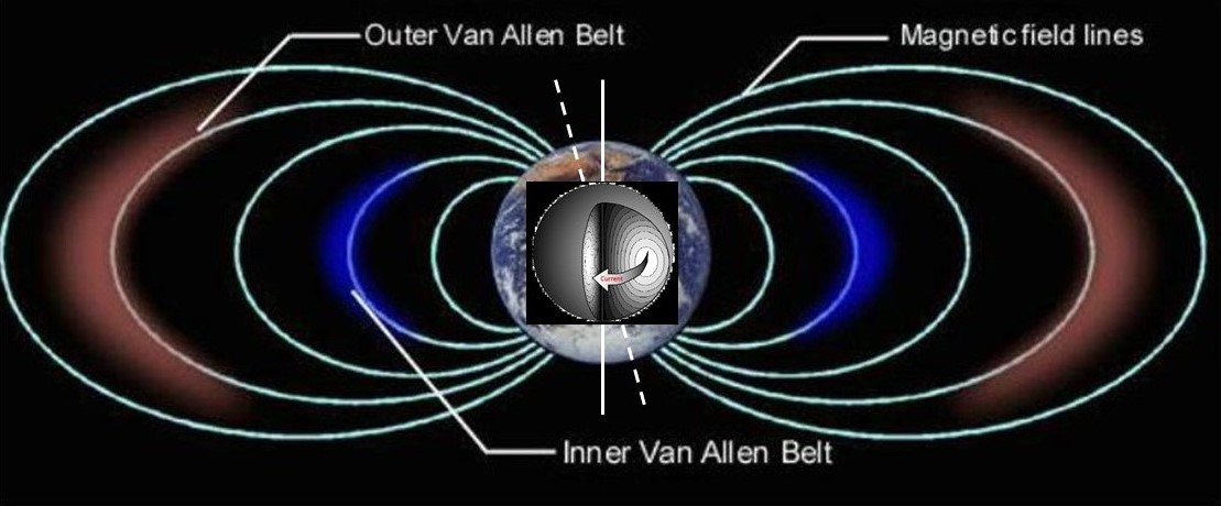 Besides the correct model for the earth’s magnetic field is free decay of the electric current circulating in the liquid iron-nickel outer core. The rotation axis of that electric current is not aligned with the planetary spin axis. Therefore the magnetic poles are offset from the geographical poles by about 10 degrees which varies over time. That misalignment could be evidence of the earth changes in the great deluge 4,500 years ago. Slow misalignment continues to this day.