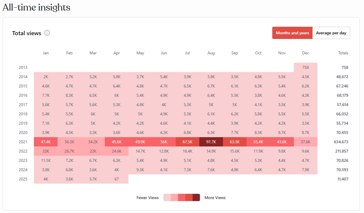 By June 2020 I started writing on the truths of vaccines with aborted fetal tissue, then the development of bioweapon shots, and the people’s demonstrations and rallies against the government diktats. COVID vaccines were introduced in December 2020, which is when the monthly views went vertical. That was a shift from the normal equilibrium.