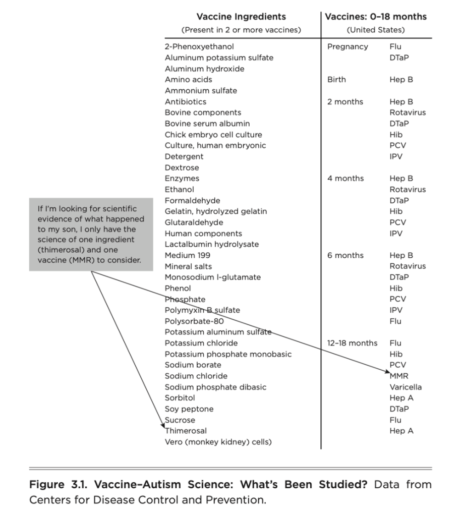 So of the first twenty vaccines given to American babies, how many have been studied for their relationship to autism? None. That’s right, because only one vaccine, the MMR, has ever been studied for its relationship to autism. The MMR is a vaccine first administered to American children at thirteen months of age. But what about the two-month, four-month, and six-month “well baby” visits during which children receive so many vaccines? The truth is none of those vaccines have ever been studied or considered for their relationship to autism, so no one has any idea. This would be like trying to identify the source of a plane crash, suspecting mechanical failure, solely analyzing one of the wings, and then declaring the entire airplane free of culpability.