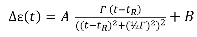 where the parameters A, B, Γ and tR are constants to be determined from the fit to the data. The parameters Γ and tR are, respectively, the full-width half maximum and the center of resonance of the Lorentzian line.