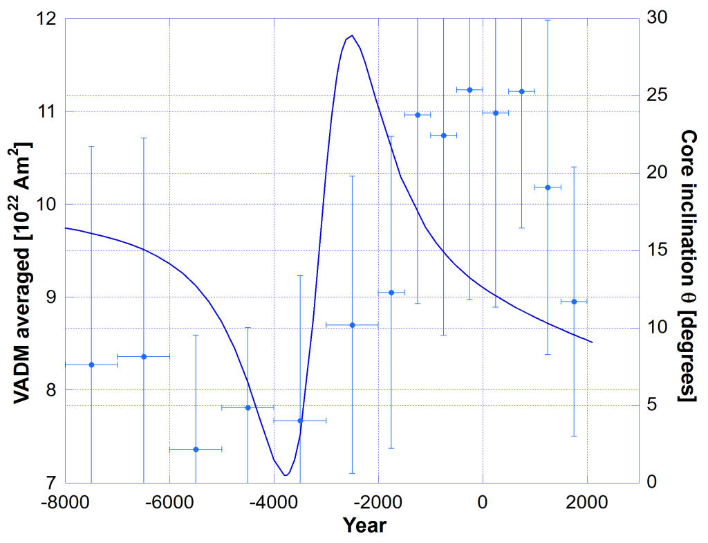 What needs to be done now is modelling on how the changing core inclination correlates to changes in the axial dipole magnetic field. I suspect the effects would have been very significant because the change in core inclination is much greater than the change in the planet’s obliquity.