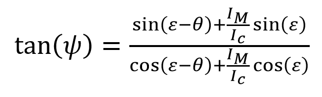 From eqs (8) and (11) tan(ψ )=0.412 radians and ψ = 22.40°. As expected only about 1° less than the polar rotation axis angle. In practice, I used the full analytic solution and had to adjust IM/Ic = 7.9 to get the angle θ = 9.21° at the present time, which is the measured value.
