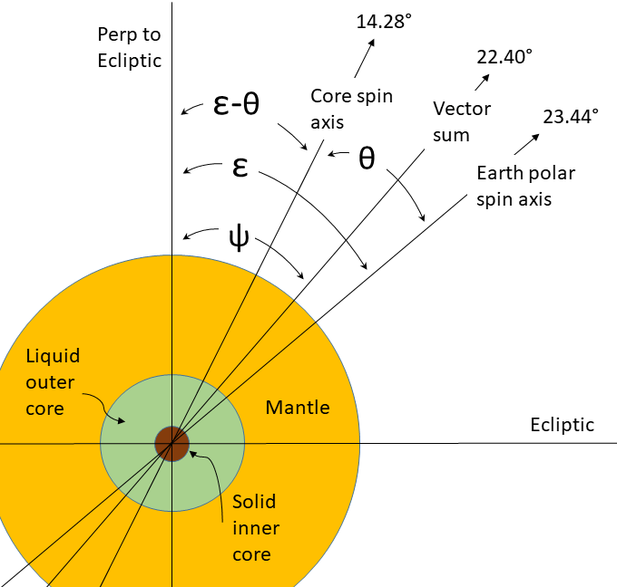The Earth’s polar spin axis is currently at ε = 23.44° from the Ecliptic, therefore the core spin axis is at an angle (ε-θ) = 14.28° from the Ecliptic.