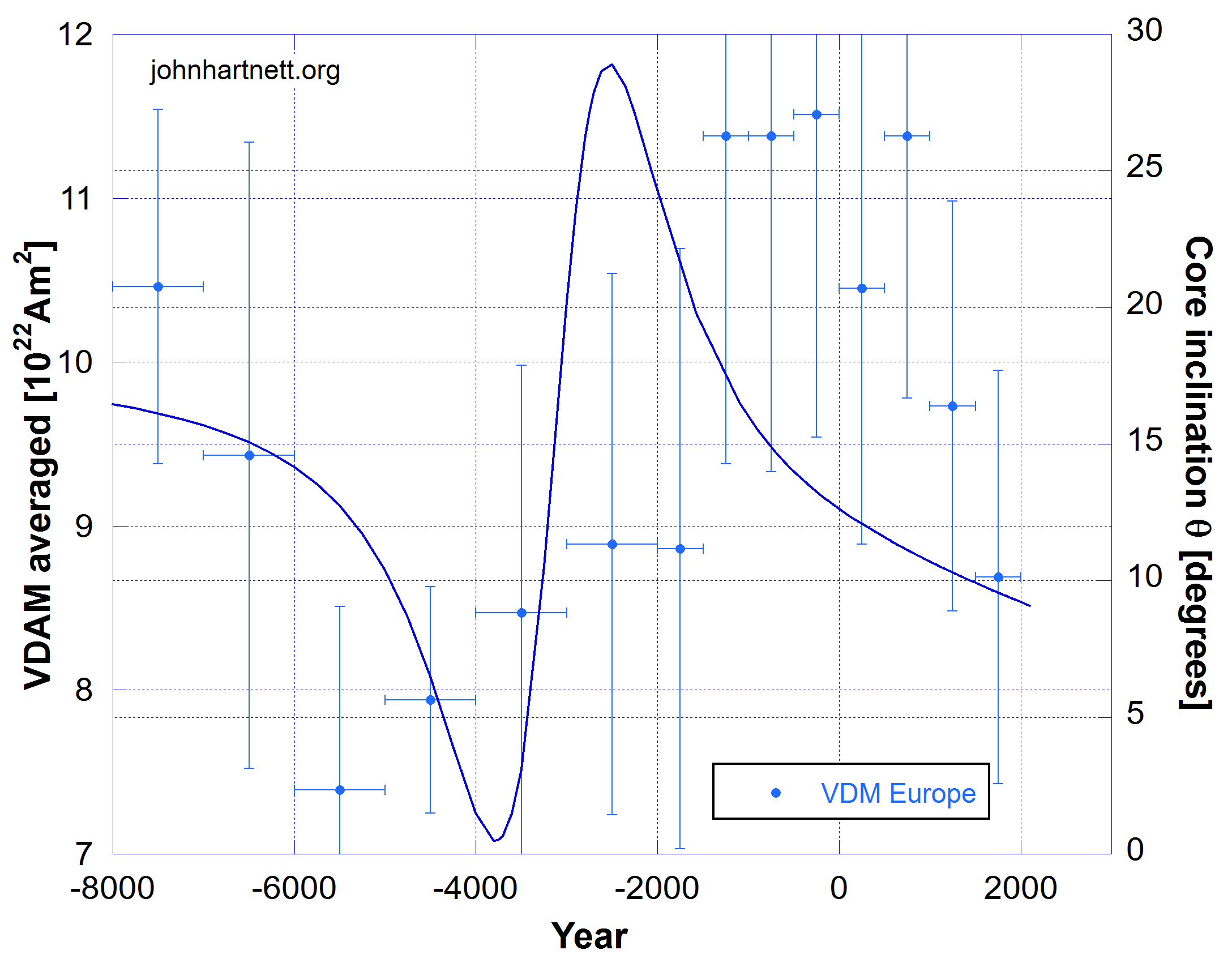 On double-Y plots in Figs 6a and 6b I show the core inclination angle compared to the averaged VADM measurements. Fig. 6a is for Europe only data and Fig. 6b is for all world-wide data.