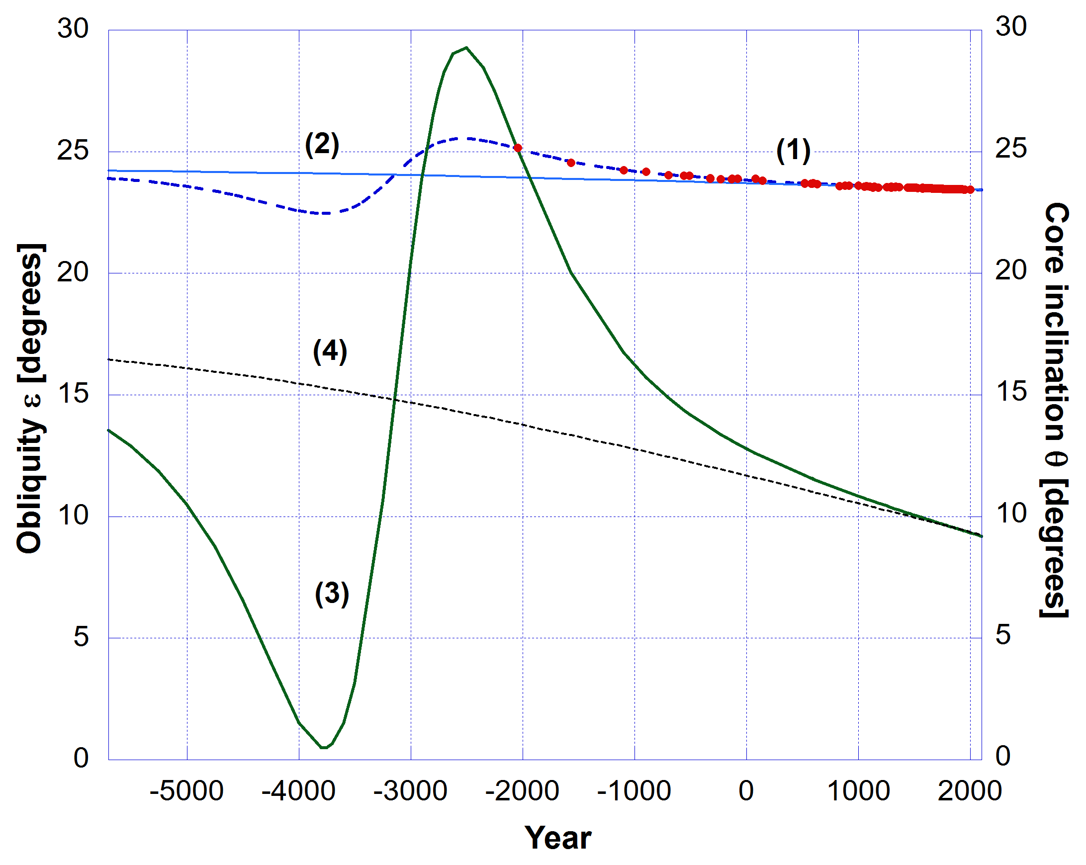 To test the idea of a correlation I found that secular archeointensity measurements of the axial dipole moment from rocks from all over the Earth show a correlation with the change in inclination of the core’s spin axis. I translated the historical Virtual Axial Dipole Magnetic (VADM) moment data into energy in the Earth’s geomagnetic dipole. These are shown in Fig. 2 as the black dashed curve (1) (Dipole Energy). Those data are compared to the change in core inclination, curve (6), right vertical axis. For this figure the large VADM errors are not shown.