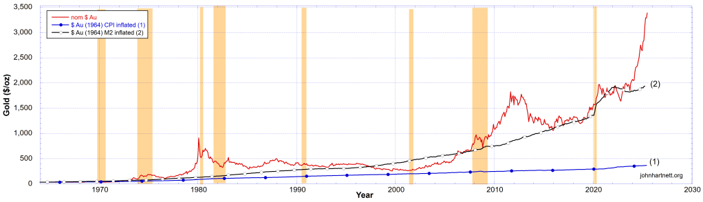 The more telling comparison is with the true value of “inflation”, actually monetary devaluation, due to the increase in the supply of currency and credit. I have calculated what 1 oz of gold should be if based on the M2 currency supply expansion since 1964 (curve (2)).