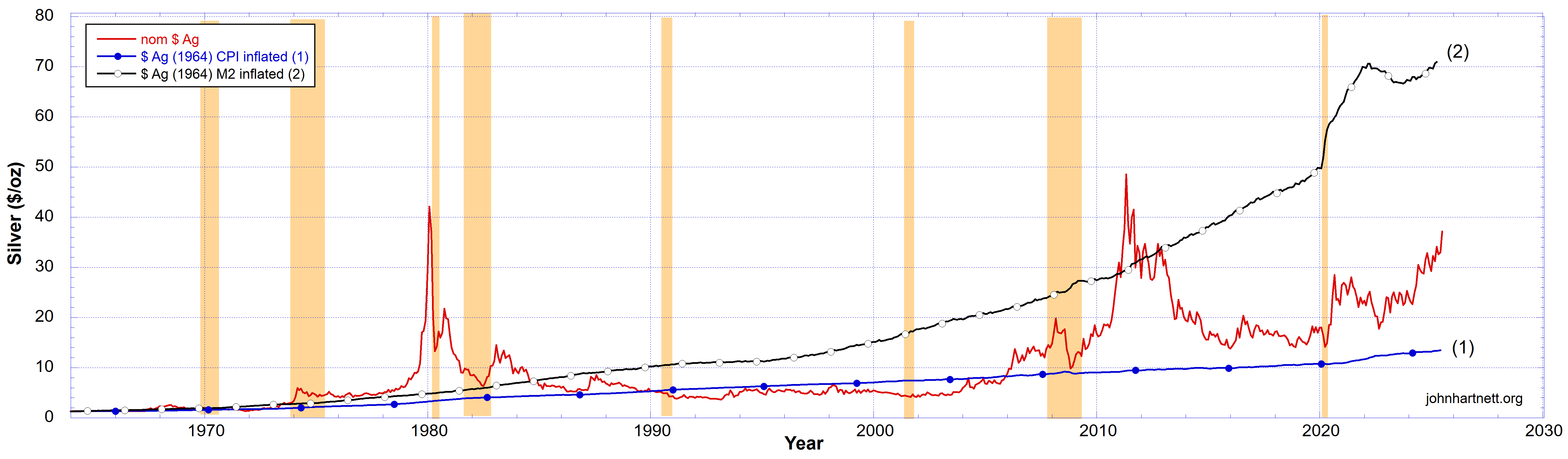 Currently silver is shown to be heavily undervalued in nominal US dollars. It is above that expected from the CPI index but well below that from the M2 expansion of the money supply. Thus today the nominal price of silver should really be closer to $70/oz.