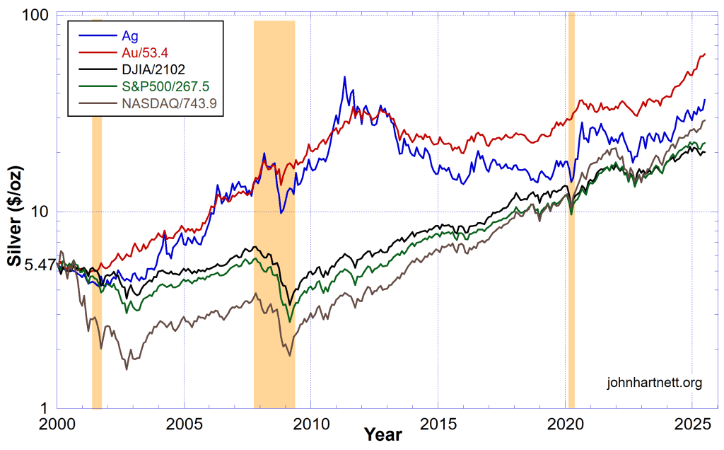 Lastly I compare the prices of gold and silver with the Dow Jones (DJIA), the S&P500 and the NASDAQ in Charts 4 and 5. Both charts also use a log Y axis.
