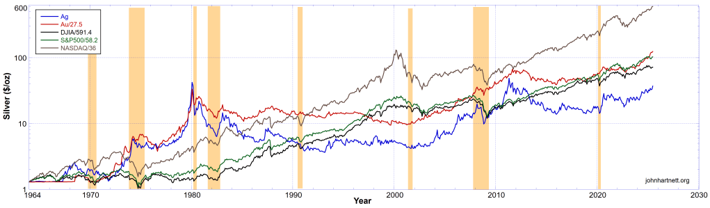 In Chart 4 the Dow Jones (DJIA), the S&P500 and the NASDAQ are appropriately scaled to equal the $1.29 price of silver in January 1964. This allows us to see how they performed compared to each other. Over the whole period since 1964 the NASDAQ (brown) outperformed the other indices and gold and silver.
