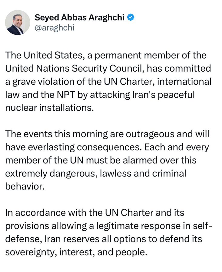 The United States, as a permanent member of the UN Security Council, has committed a blatant violation of the UN Charter, international law, and the Nuclear Non-Proliferation Treaty by attacking Iran’s peaceful nuclear facilities.