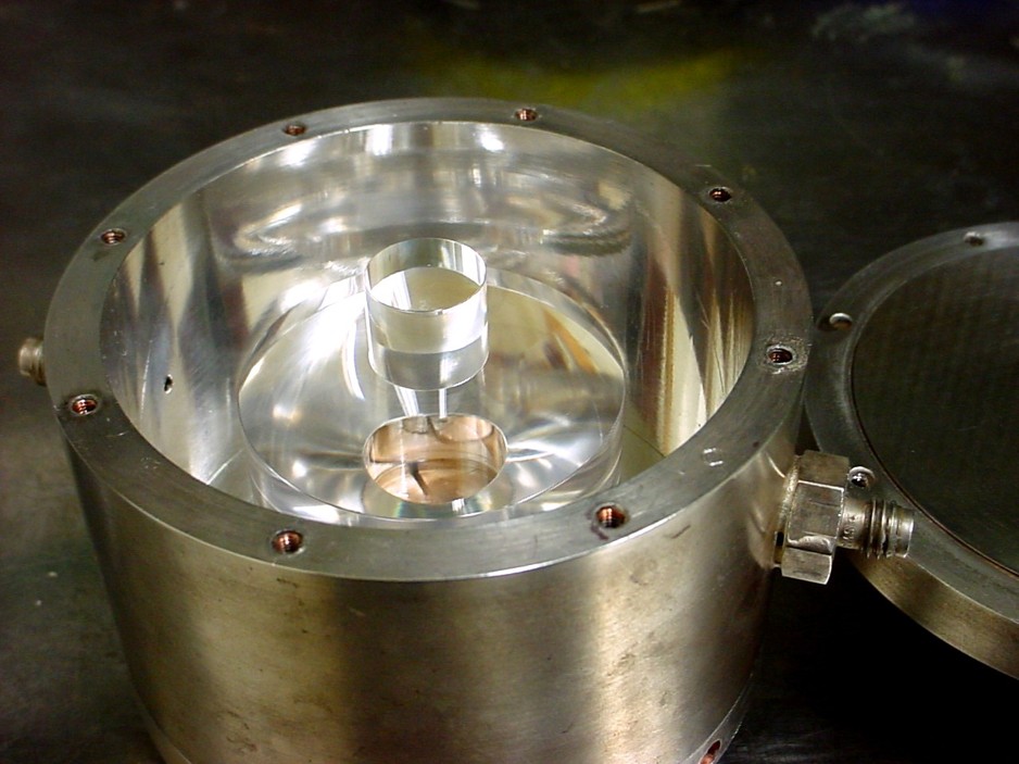 Figure 6: A man-made low-defect density HEMEX sapphire 5 cm diameter crystal is the resonator for a cryogenic sapphire “clock”, called cryoclock.
