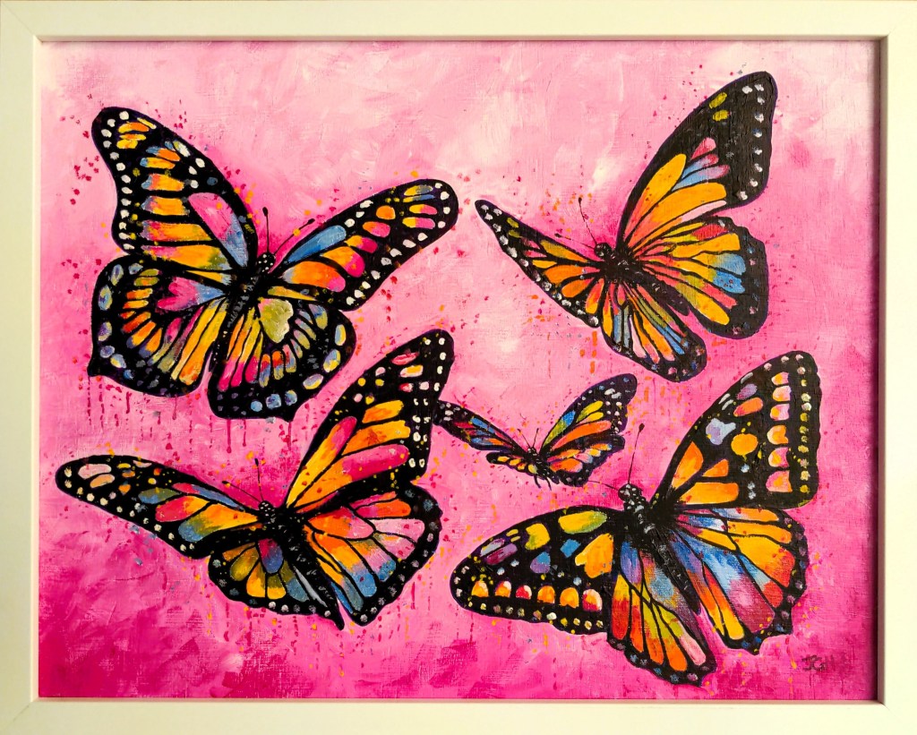 FOR SALE: Coloured Butterflies, 35 x 28 cm (excl. frame), acrylics on board, framed, $175, 2025FOR SALE: Monarch 3, 25 x 20 cm (excl. frame), oils on board, framed, $50, 2025FOR SALE: Colourful Butterfly, 25 x 20 cm (excl. frame), acrylics on board, framed, $50, 2025FOR SALE: 5 Coloured Butterflies, 35 x 28 cm (excl. frame), acrylics on board, framed, $175, 2025